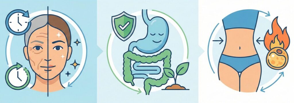 16時間断食を行うメリットは、体重が減ることだけにとどまりません。むしろ、健康と美容へのインパクトの方が大きいと言えます。