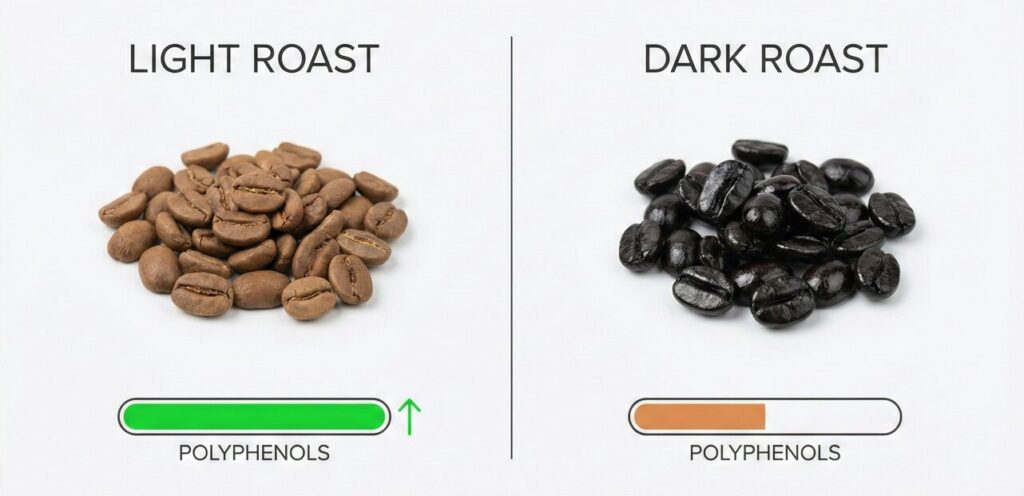 - 深煎り: 苦味が強く、ポリフェノール少なめ。
