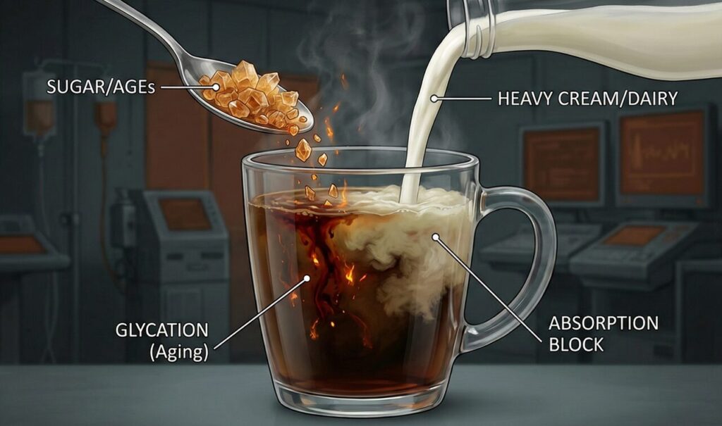 アンチエイジングの大敵は「酸化」と「糖化」です。砂糖たっぷりのコーヒーは、肌のコラーゲンを破壊する「糖化(コゲ)」を招きます。