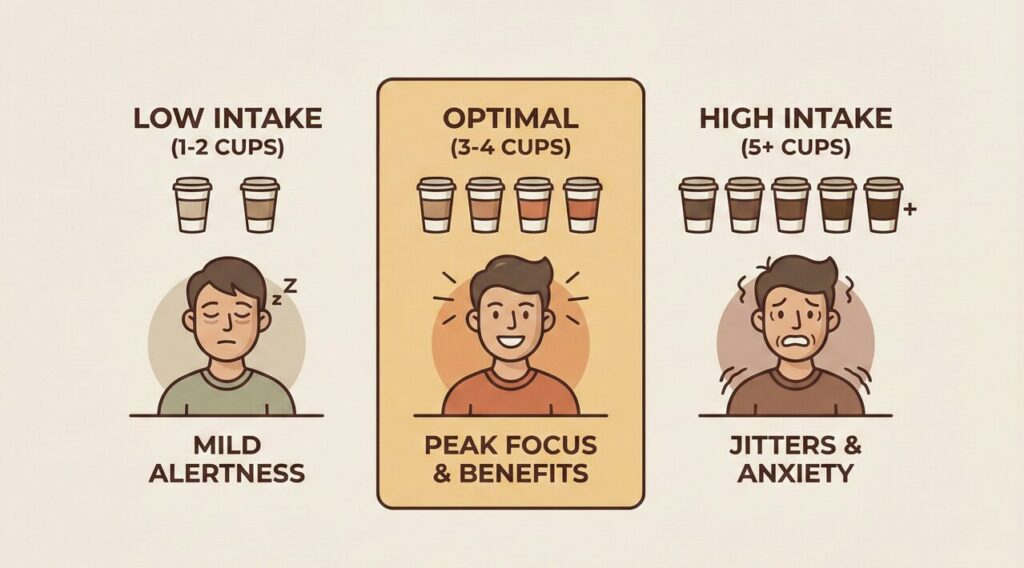- 5杯以上: カフェインの過剰摂取により、コルチゾール(ストレスホルモン)が増加し、逆に老化を早めるリスクがあるため注意。