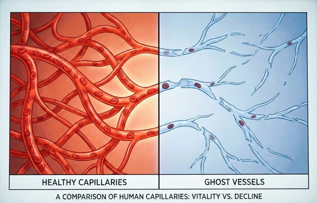 冷え性の裏側で静かに進行しているのが、近年話題の「ゴースト血管」化現象です。血管が消えてしまうこの現象は、肌のシワ、たるみ、そして全身の老化に直結しています。