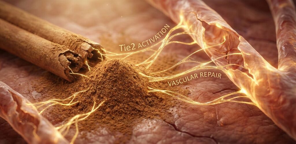 シナモンに含まれる成分(シンナムアルデヒドなど)には、このTie2を活性化させる働きがあります。つまり、剥がれかけた血管の壁を修復し、血液の漏れを防ぎ、ゴースト化した血管を復活させる効果が期待できるのです。