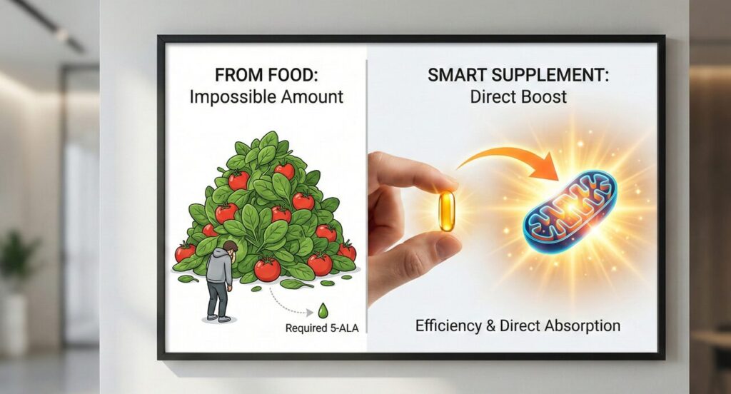 5-ALAは「ミトコンドリア活性化の着火剤」とも呼ばれる重要な成分ですが、残念ながら年齢とともに体内での生産量は激減します。 これを食品で補おうとすると、例えばトマトなら約500kg以上、ほうれん草なら約300kg以上を毎日食べなければならない計算になります。さすがにこれは現実的ではありませんよね。