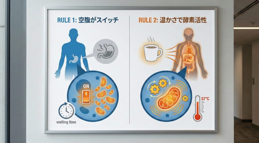 何を飲むかも大切ですが、「どう飲むか」で効果は倍増します。ミトコンドリアを本気で増やしたいなら、以下の2つのルールを意識してください。