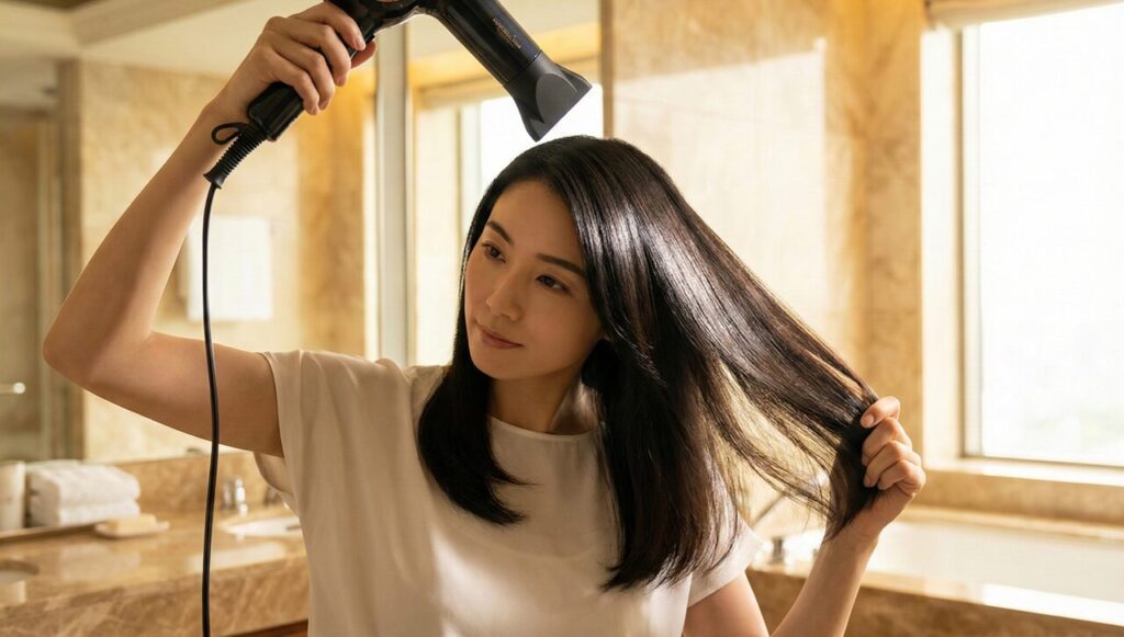 Pro Tip: 最後は冷風を当てながら、手のひらで髪表面を優しく撫で下ろしてください。手の油分と体温、そして冷風の引き締め効果で、サロン帰りのような極上の手触りになります。