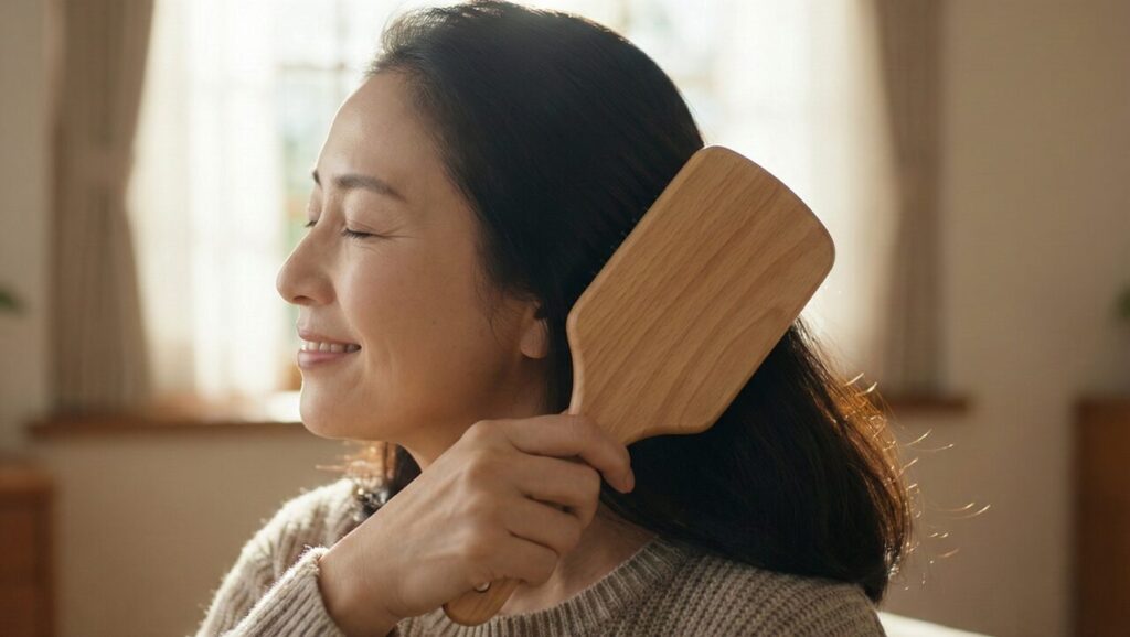 Pro Tip: ブラッシングは「顔のリフトアップ」にも効果的です。頭皮と顔の皮は一枚でつながっています。下から上へ引き上げるようにブラッシングすることで、頭皮のたるみをケアしましょう。