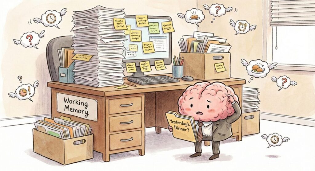 その結果、「新しい情報(昨日の食事)」を置く場所がなくなり、記憶として定着する前に消えてしまうのです。これが「思い出せない」の正体です。